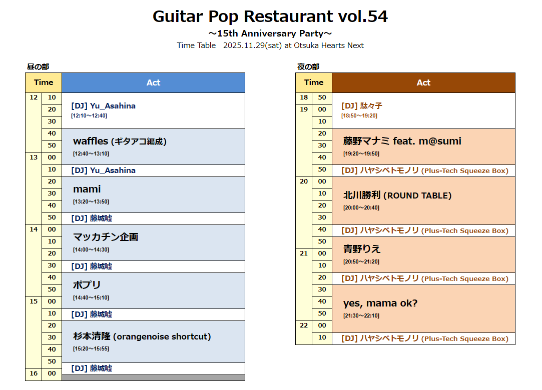 | LIVE: | 杉本清隆 (orangenoise shortcut) / マッカチン企画 / mami / ポプリ / waffles (ギタアコ編成) | |||||||