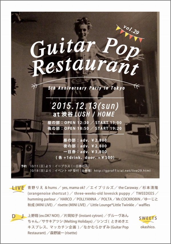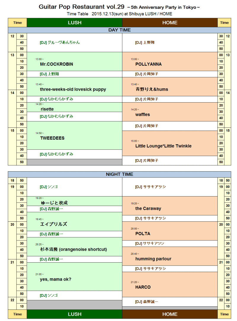 | DJ: | 上野翔 (ex.OK?NO!!) / 片岡知子 (instant cytron) / グルーヴあんちゃん / なかむらかずみ (Guitar Pop Restaurant) |
