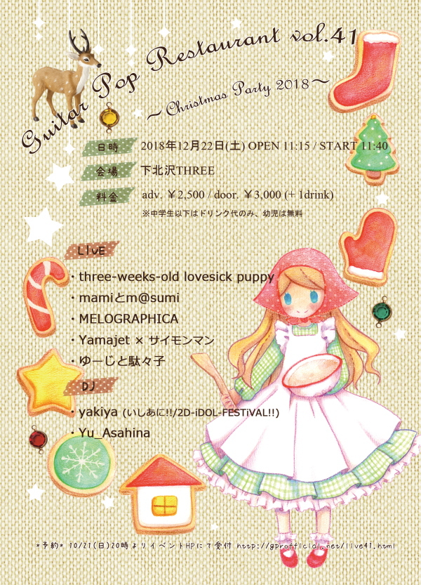| LIVE: | three-weeks-old lovesick puppy / mamiとm@sumi / MELOGRAPHICA / Yamajet × サイモンマン / ゆーじと駄々子 |