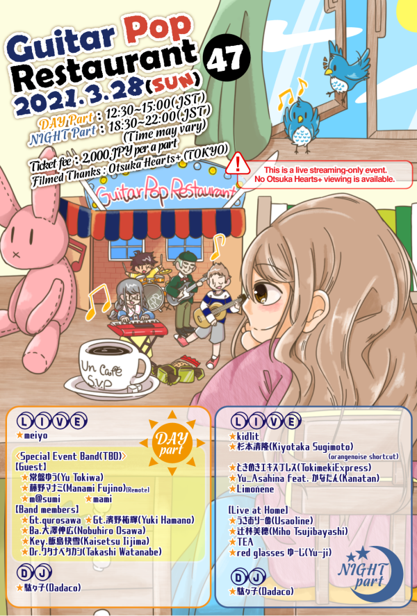 March 28, 2021 (Sun) Day part: 12:30 PM - 3:00 PM (JST) Night part: 6:30 PM - 10:00 PM (JST) * Time may vary. Archives: until March 30, 2021 (Tue) (You can watch it as many times as you like during the archive period.) |