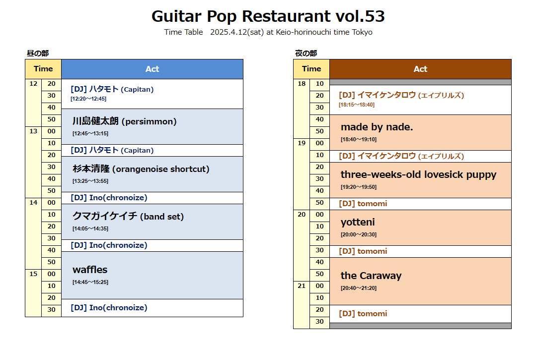 | LIVE: | 川島健太朗 (persimmon) / クマガイケイチ (band set) / 杉本清隆 (orangenoise shortcut) / waffles | |||||||